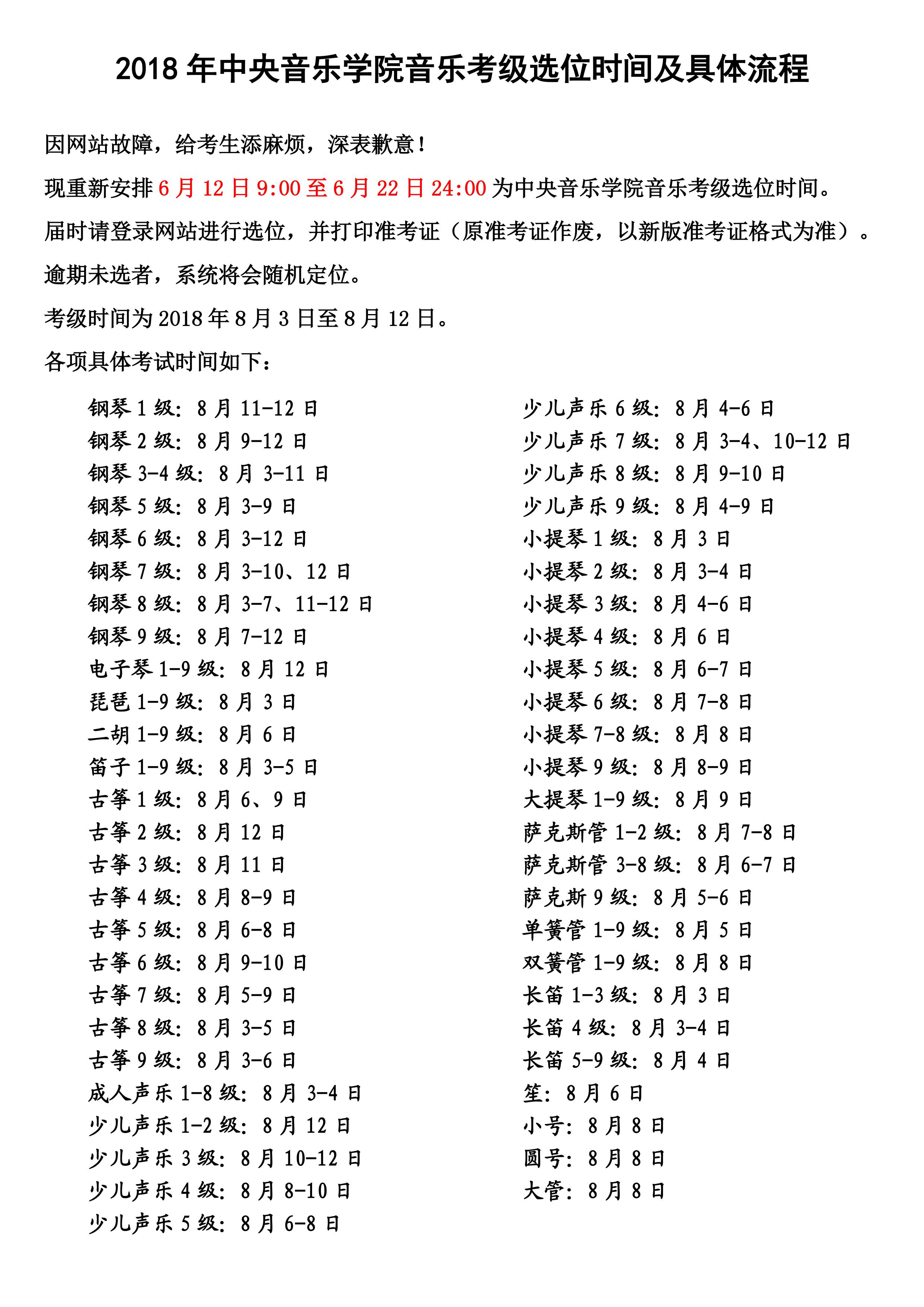 2018年中央音乐学院音乐考级“重新”选位时间及具体流程